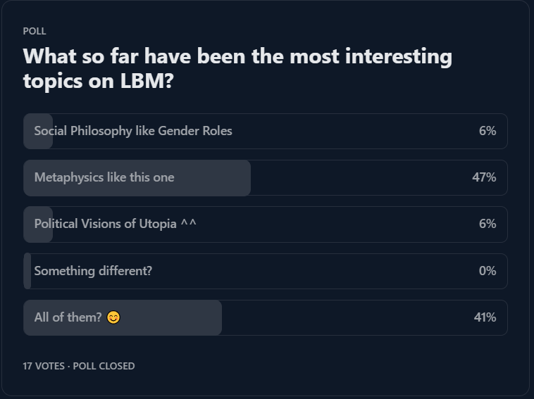 This one I found honestly hilarious since my metaphysics pieces are probably the worst performing ones I post xD But thats selection bias I guess and it shows that those who are most interested in what I do share the same passion as me!