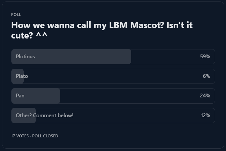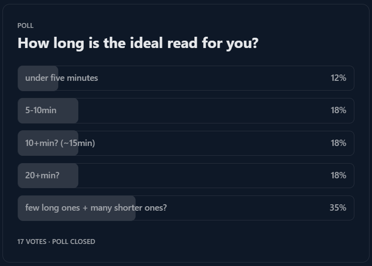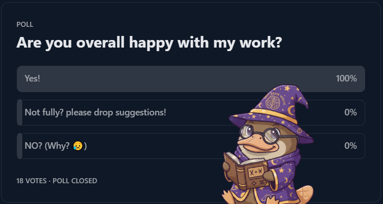 I know this is also just selection bias xD those who don’t really vibe with my work probably didnt partake in the polls. But thank you anyway. I continue to strive for improving myself and serve you entertaining bits of wisdom, knowledge and new perspectives.